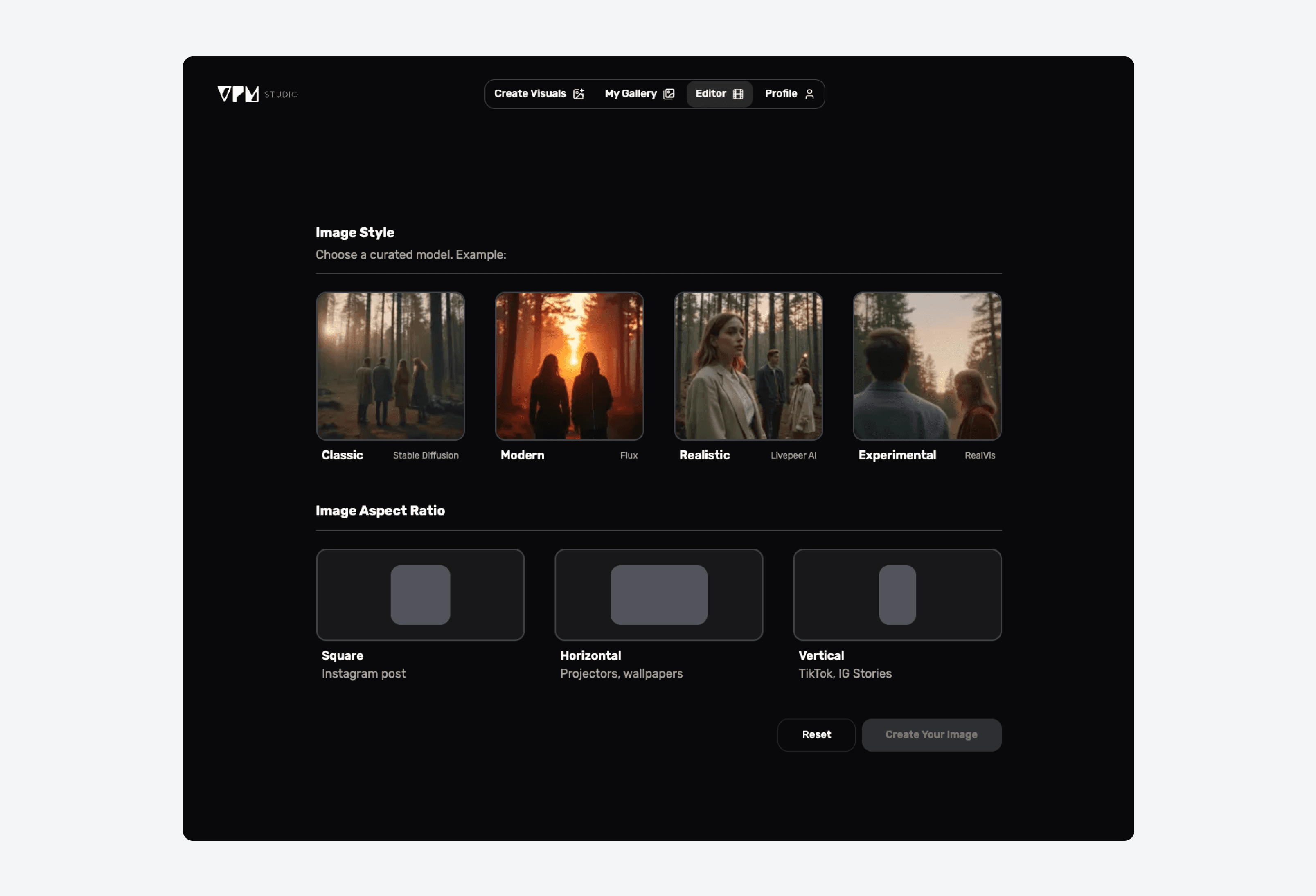 VPM Studio offers unparalleled creative flexibility with 4 different styles, each powered by its own specialized AI model. These styles enable users to produce uniquely styled visuals tailored to their creative needs. Additionally, VPM supports 3 versatile aspect ratios: square, horizontal, and vertical, make visuals fit perfectly anywhere - whether it’s Instagram, TikTok, or a presentation.
